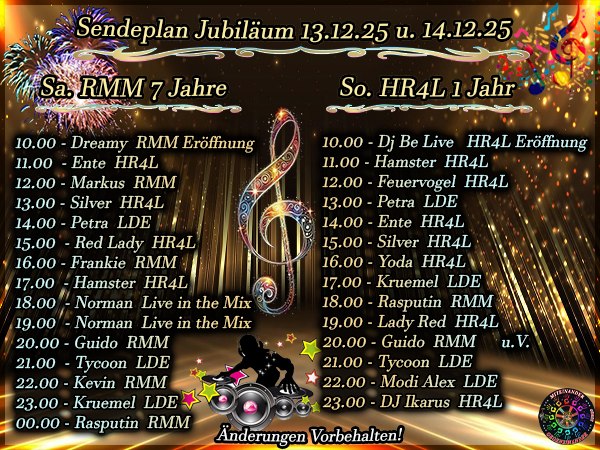Dreamy (13.12.2025 22:28): Ich möchte mich bei allen ganz Herzlich bedanken das ihr alle heute dabei seid an Mein Team an LDE an Hitradio 4 Live und an Live in the Mix Herzliches Dankeschön Hitradio 4 Live (13.12.2025 20:42): huhu Fitty hier von Hitradio 4 Live erst Hammer Geburtstag Wir sagen Danke Rasputin (07.12.2025 23:01): ich wünsche dir eine fröhlich woche Dreamy (07.12.2025 09:31): Guten Morgen euch allen einen schönen 2.Advent admin (07.12.2025 03:56): Guten Morgen Delta Force (15.02.2024 21:02): Hallihallo Radio Musik Momente admin (15.02.2024 20:47): Hallöchen